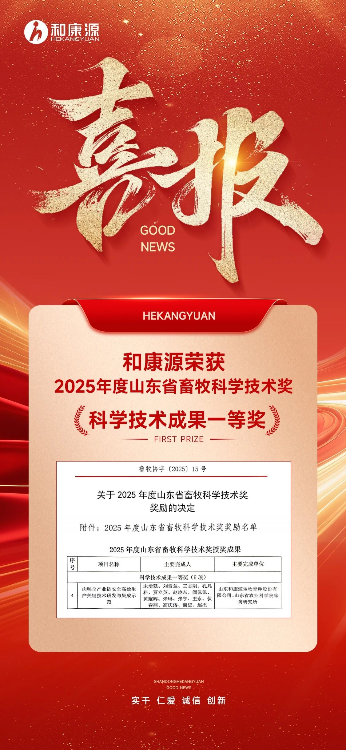 喜報(bào) | 和康源榮獲2025年山東省畜牧科學(xué)技術(shù)一等獎(jiǎng)