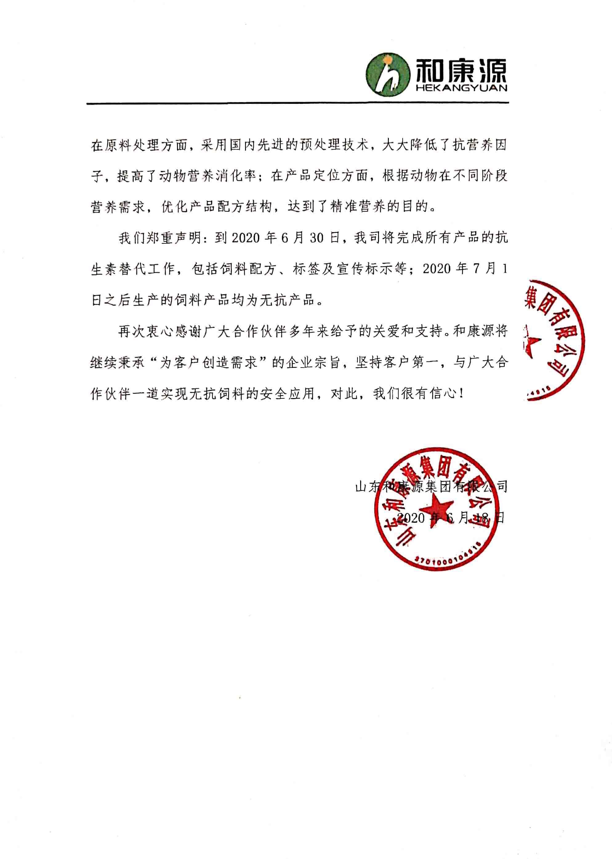 和康源秉持“今天你我多一點(diǎn)良心,明天社會(huì)多一份健康”的企業(yè)使命,一直以來致力于飼料產(chǎn)品研發(fā)升級(jí)。2019年7月19日,國家頒布?中華人民共和國農(nóng)業(yè)部第194號(hào)公告?,規(guī)定于2020年7月1日起,飼料生產(chǎn)企業(yè)停止生產(chǎn)含有促生長類藥物飼料添加劑(中藥類除外)的商品飼料。為了實(shí)現(xiàn)向無抗飼料的平穩(wěn)過渡,我司作出如下聲明: