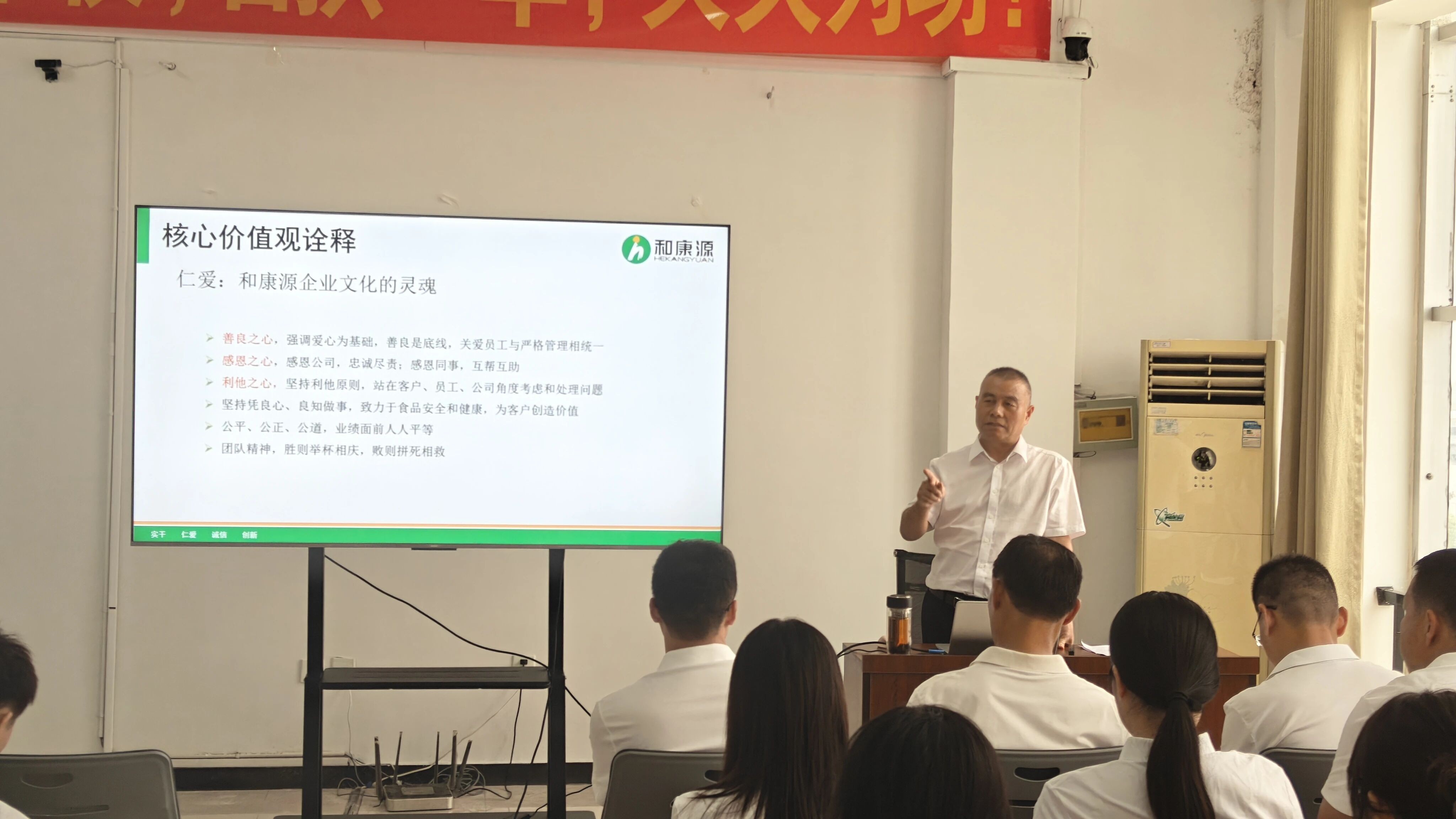 ? ? ? 本次培訓(xùn)在辦公樓三樓大會議室準(zhǔn)時啟幕。蘭陵惠生食品總經(jīng)理郭超致辭拉開序幕,和康源集團(tuán)董事長孟慶利圍繞企業(yè)文化與發(fā)展歷程展開分享。孟總從和康源創(chuàng)業(yè)初心,到逐步構(gòu)建全產(chǎn)業(yè)鏈布局,深入淺出闡述了和康源如何在市場競爭中逐步構(gòu)建起如今的產(chǎn)業(yè)格局,詳細(xì)講解了“實(shí)干、仁愛、誠信、創(chuàng)新”這一核心價值觀在企業(yè)發(fā)展進(jìn)程中的具體體現(xiàn)。他談到“馬太效應(yīng)”強(qiáng)調(diào)愛不是平均主義,而是以奮斗者為本。孟總還強(qiáng)調(diào)蘭陵惠生前三年一定要夯實(shí)根基,日拱一卒!這樣才能有助于蘭陵惠生的長期發(fā)展。隨后還詳細(xì)的講述了企業(yè)經(jīng)營管理理念和三條“高壓線”,這些文化理念正是企業(yè)實(shí)現(xiàn)長期穩(wěn)健發(fā)展的內(nèi)在動力源泉。