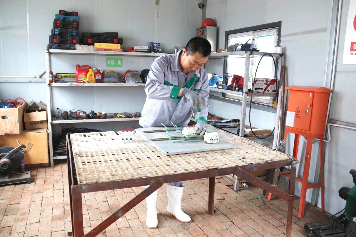 除了日常的維修工作,馬師傅還時不時的幫忙場里的其他工作,我們見到馬師傅的時候,正巧他幫忙裝蛋車回來,馬師傅說,哪里需要哪里干,大家一起裝蛋車,確保鴨蛋能夠及時地運往孵化場。隨后,跟隨馬師傅走進不大的修理間,映入眼簾的是整整齊齊的維修工具,配件分類擺放,標簽清晰明了,中間一個自制的工作臺,干凈整潔,這就是馬師傅的工作小天地,整潔的工具間讓我們對馬師傅的工作頗有敬意。
