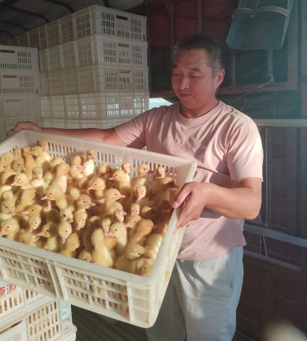 ? ? 在熾熱的夕陽(yáng)余暉下,空氣中仍彌漫著不容忽視的悶熱。和櫻孵化場(chǎng)司機(jī)馬偉,汗水早已濕透了他的衣衫,卻絲毫沒(méi)有減緩他忙碌而堅(jiān)定的步伐。他彎下腰,一筐筐沉甸甸的鴨苗在他有力的雙臂間穩(wěn)穩(wěn)傳遞,每一次搬運(yùn)都是對(duì)體力與毅力的雙重考驗(yàn)。
