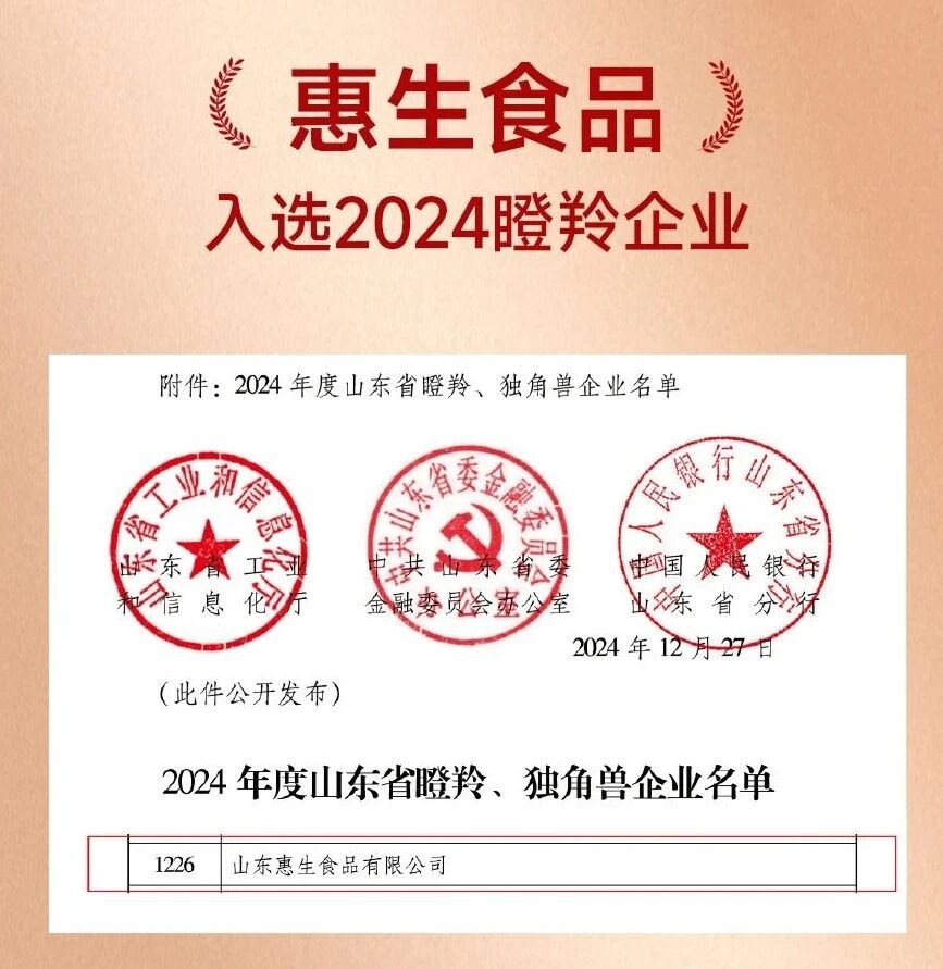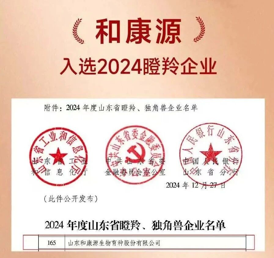 山東和康源生物育種股份有限公司及山東惠生食品有限公司,均入選“2024年度山東省瞪羚企業(yè)”。政府工作報告中提到的“瞪羚企業(yè)”支持與發(fā)展戰(zhàn)略,為和康源及惠生食品注入了強勁的發(fā)展動力。